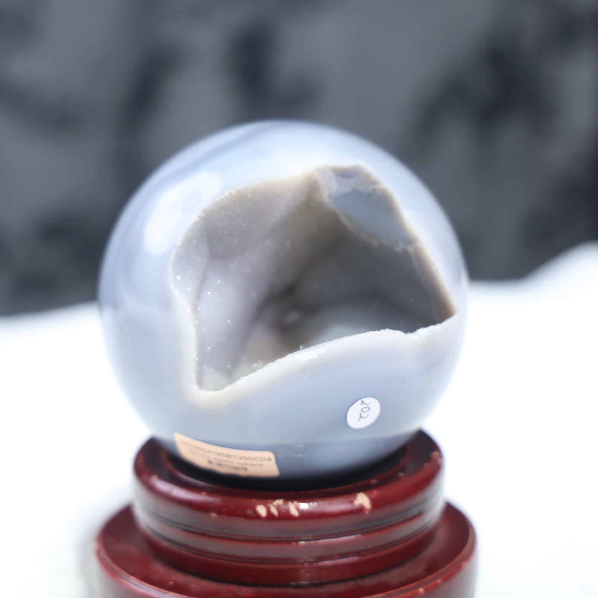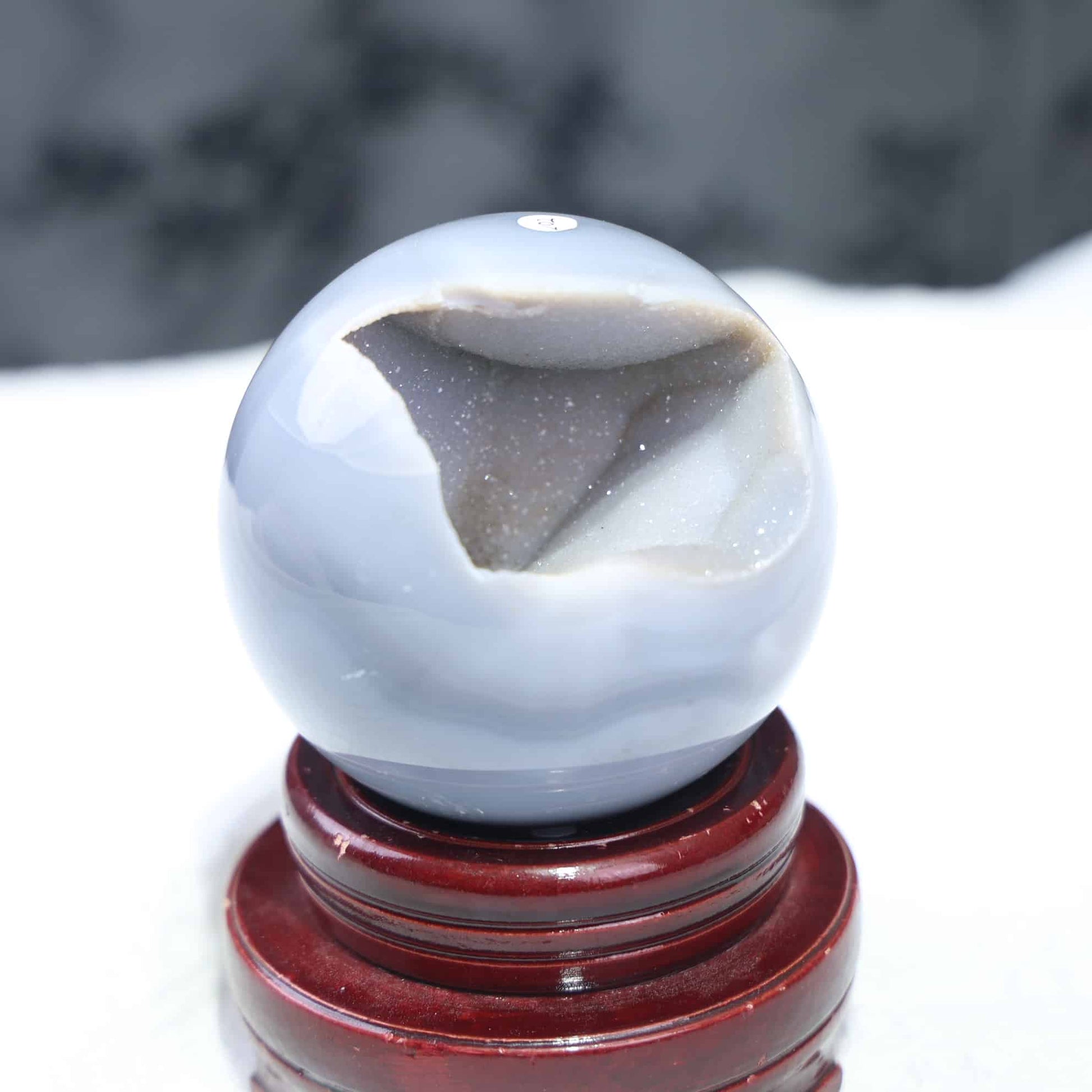A gemstone formed when tiny, sparkling quartz crystals grow over an agate base, typically within volcanic rock cavities