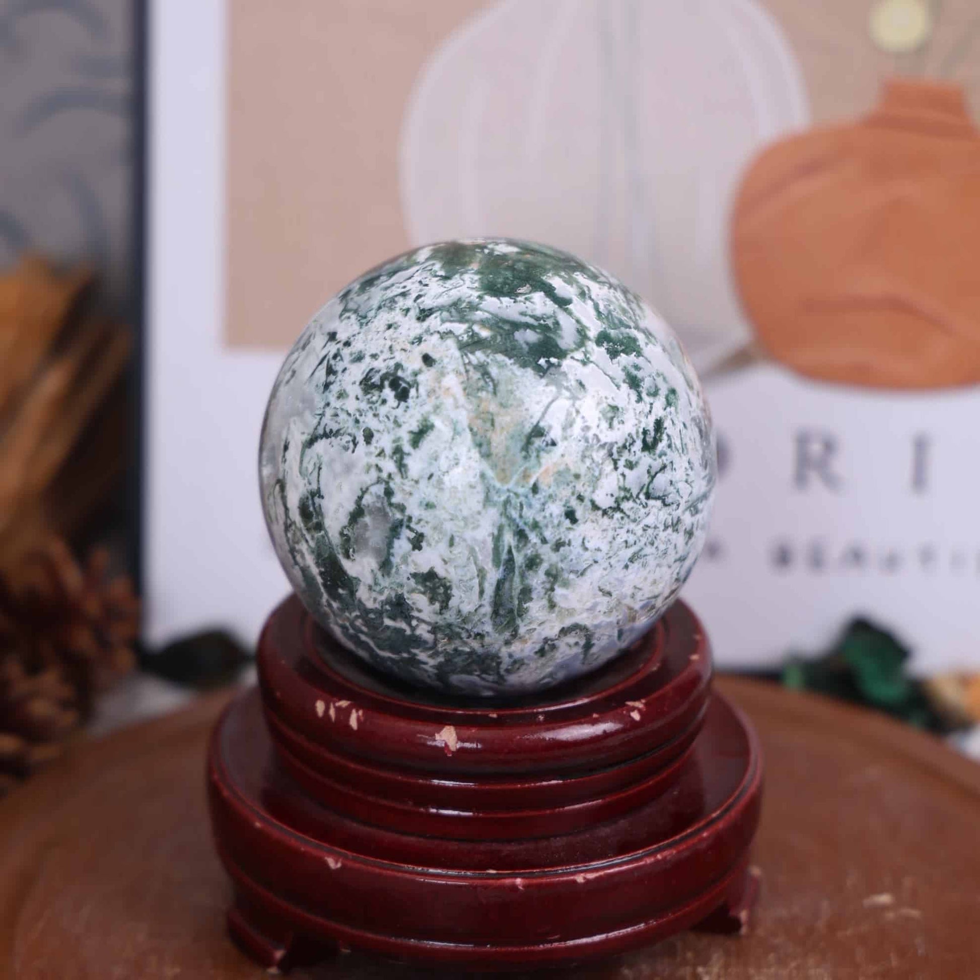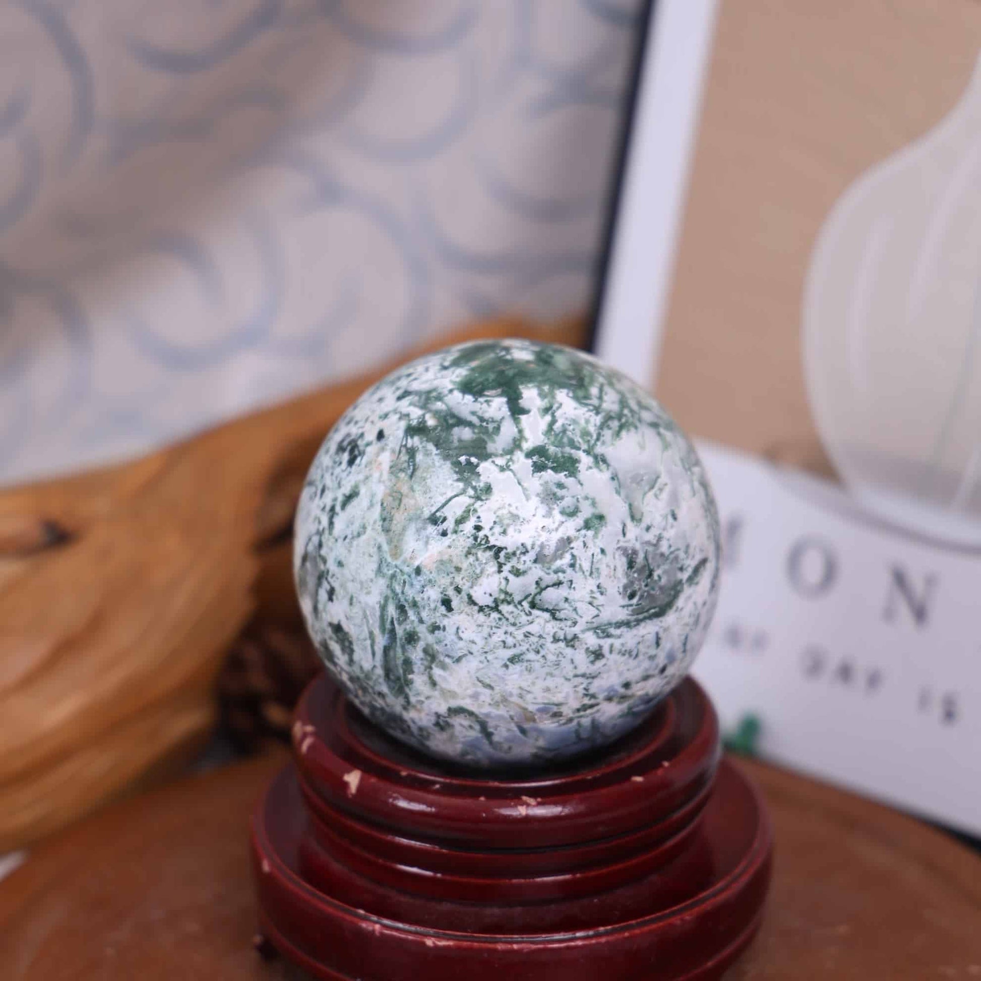 A green-inclusions-in-quartz, chalcedony variety (not true agate) known for its moss-like, dendrite, or forest-like patterns created by iron or manganese oxides.