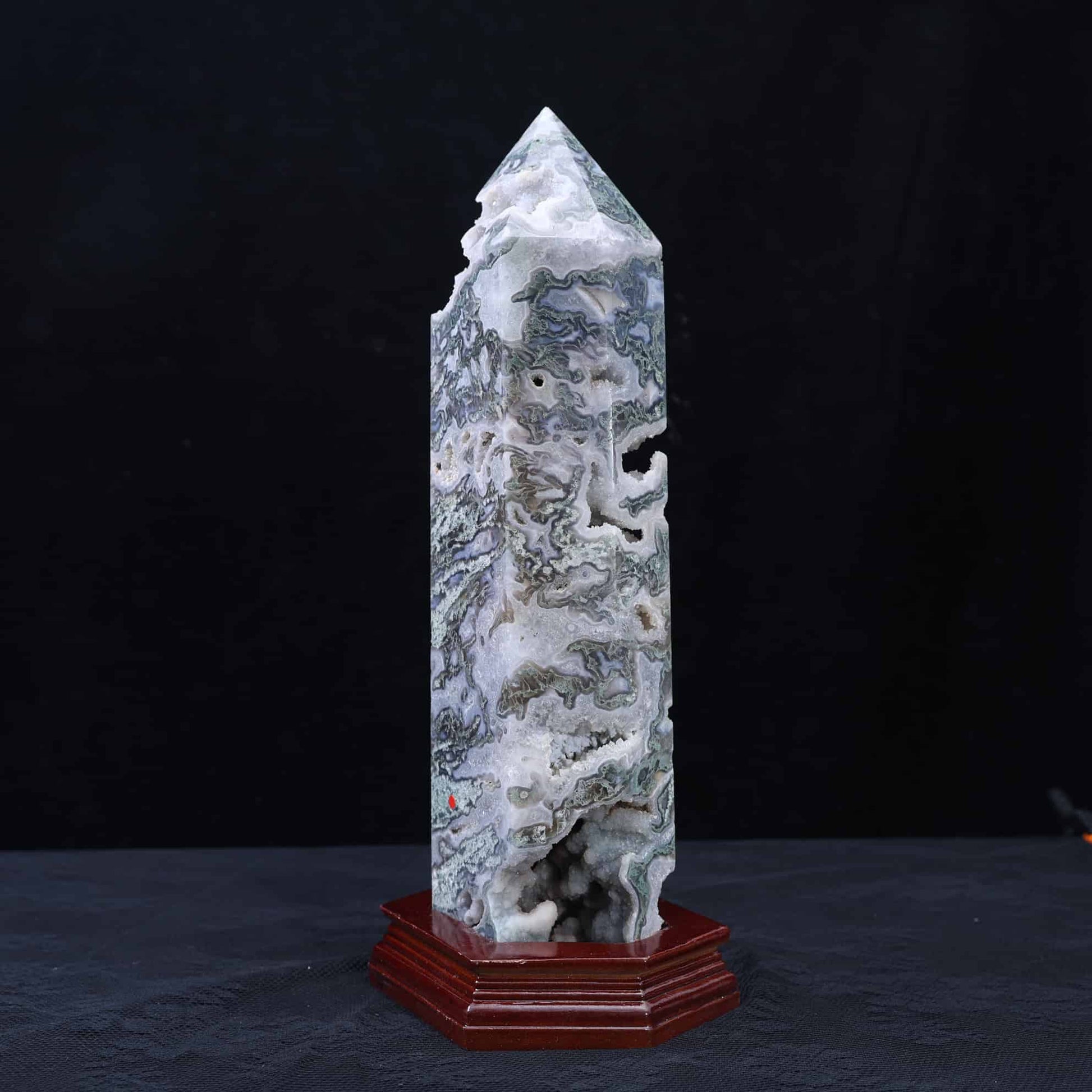 A green-inclusions-in-quartz, chalcedony variety (not true agate) known for its moss-like, dendrite, or forest-like patterns created by iron or manganese oxides.