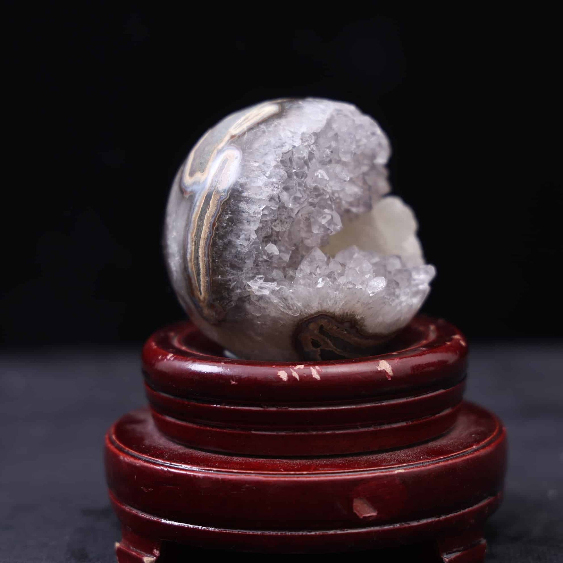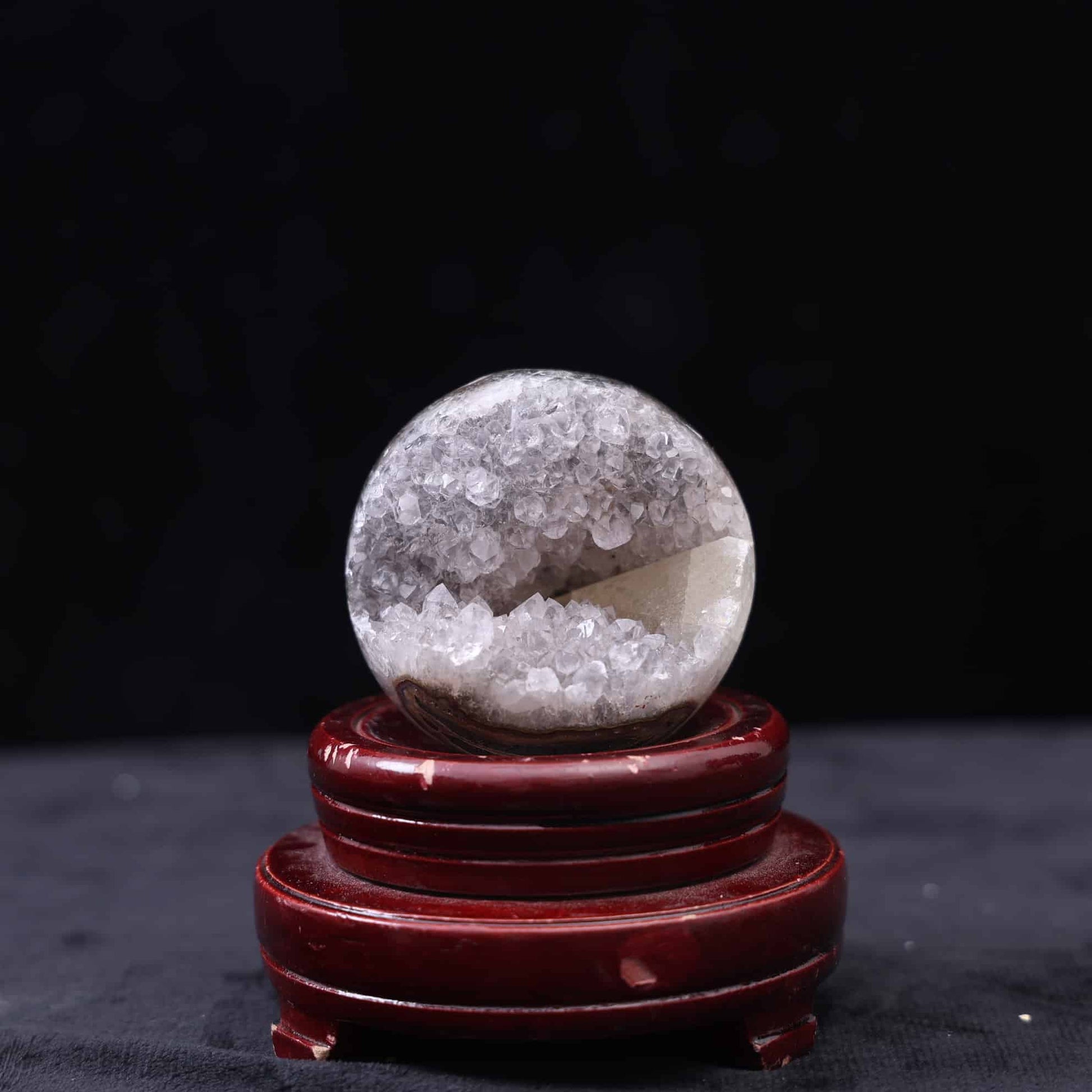 A gemstone formed when tiny, sparkling quartz crystals grow over an agate base, typically within volcanic rock cavities